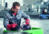 Schmutzige Geräte und Kleinteile sind täglich zu reinigen – heute in dieser Ecke, morgen am anderen Ende der Halle. Da ist es praktisch, wenn nicht die ölverschmierten Geräte durch den ganzen Betrieb getragen werden müssen, sondern der Waschtisch an wechselnde Standorte gerollt werden kann. MEWA bietet den Pinselwaschtisch Bio-Circle in zwei Ausführungen an – als Mini und als Maxi. Der kleinere Waschtisch ist besonders wendig und hat eine Tragkraft von 90 Kilogramm, der größere erweist sich mit einer Tragkraft von 220 Kilogramm als besonders robust und leistungsstark. Beide Modelle sind mit Rollen ausgestattet.